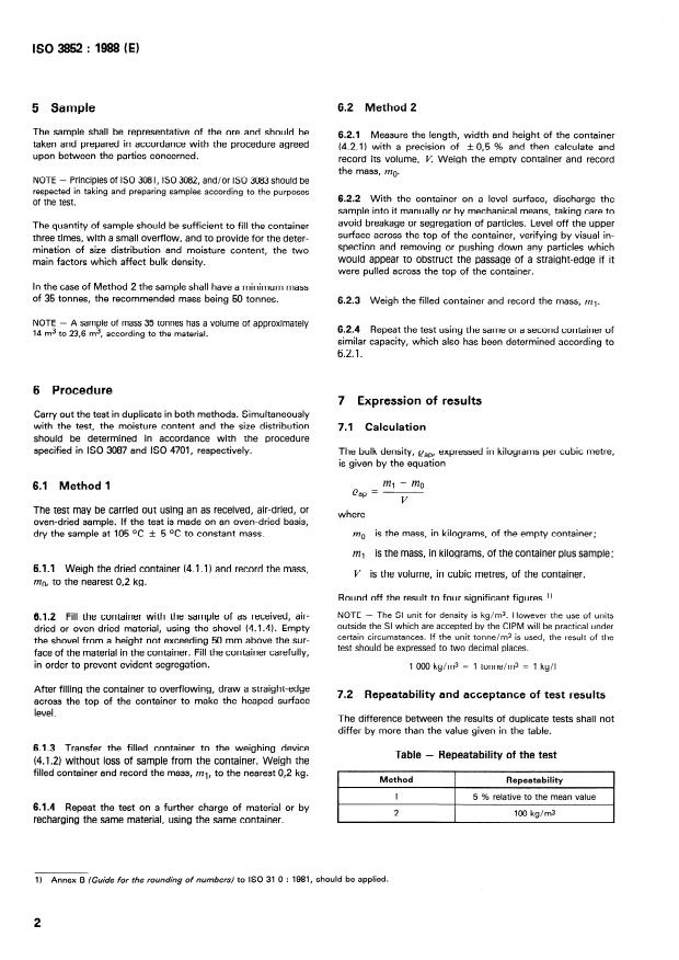 ISO 3852:1988 is a standard published by the International Organization for Standardization (ISO). Its full title is "Iron ores — Determination of bulk density". This standard covers: This second edition cancels and replaces the first edition (ISO 3852:1977) and ISO 5464:1980, and includes the determination of bulk density for particles greater than 40 mm. Specifies two methods for measuring the bulk density of natural and processed iron ores.