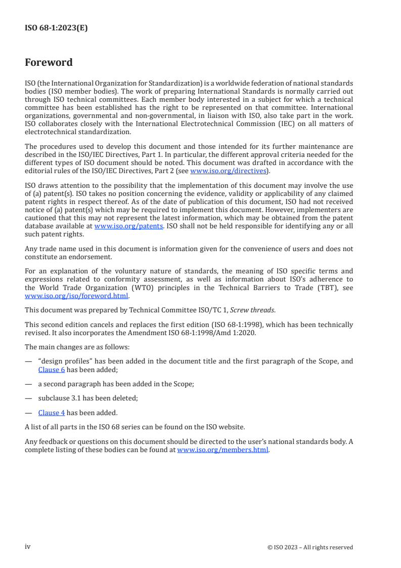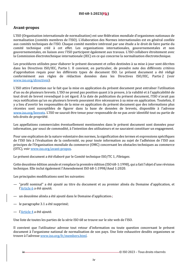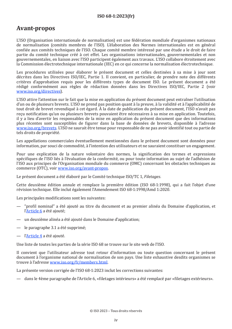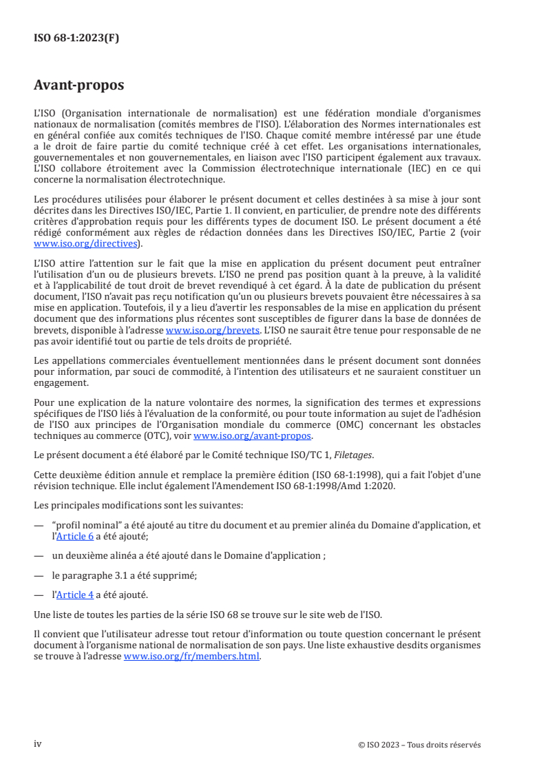 Cette deuxième édition annule et remplace la première édition (ISO 68-1:1998), qui a fait l'objet d'une