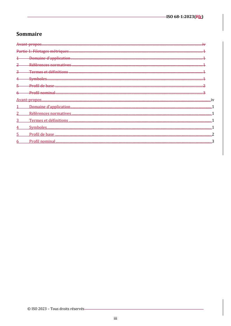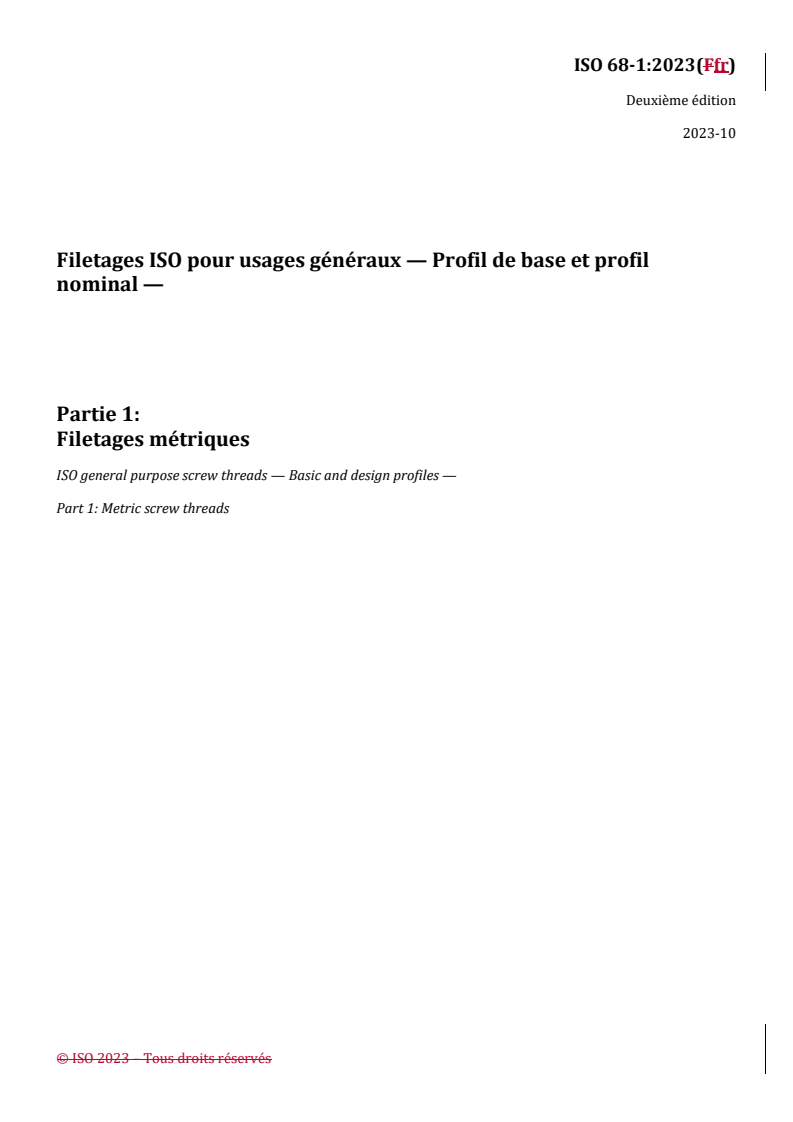 REDLINE ISO 68-1:2023 - Filetages ISO pour usages généraux — Profil de base et profil nominal — Partie 1: Filetages métriques Released:3/21/2024