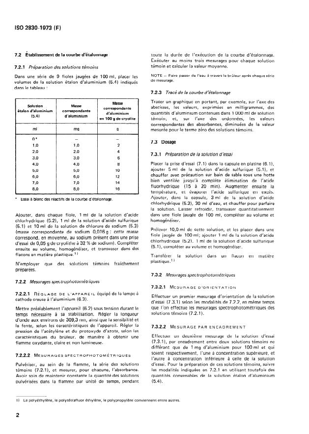 ISO 2830:1973 is a standard published by the International Organization for Standardization (ISO). Its full title is "Cryolite, natural and artificial - Determination of aluminium content - Atomic absorption method". This standard covers: Applicable to products having a normal composition for which the molar ratio NaF/AlF3 is equal to about 3. Dissolution of a test portion in concentrated suphuric acid and elimination of hydrogen fluoride. Treatment with hydrochloric acid and water. Atomization of the solution into an acetylene measurement of the absorption of the 309.3 nm line emitted by an aluminium hollow cathode lamp. Has also been approved by the IUPAC.