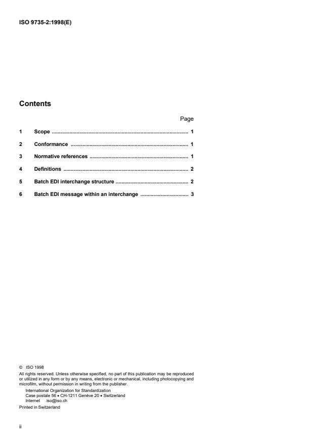 ISO 9735-2:1998 is a standard published by the International Organization for Standardization (ISO). Its full title is "Electronic data interchange for administration, commerce and transport (EDIFACT) — Application level syntax rules (Syntax version number: 4) — Part 2: Syntax rules specific to batch EDI". This standard covers: Electronic data interchange for administration, commerce and transport (EDIFACT) — Application level syntax rules (Syntax version number: 4) — Part 2: Syntax rules specific to batch EDI