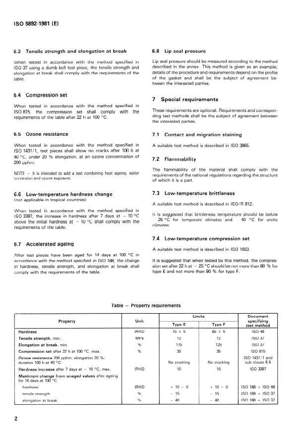 ISO 5892:1981 is a standard published by the International Organization for Standardization (ISO). Its full title is "Rubber building gaskets — Materials for preformed solid vulcanized structural gaskets — Specification". This standard covers: Specifies material requirements in sealing operations where both resistance to stress relaxation and resistance to weathering are essential. Relates particularly to gaskets of the lock-strip type. Does not give the material requirements for gaskets used for sealing glazing and panels. An annex with figures refers to lip seal pressure measurement.
