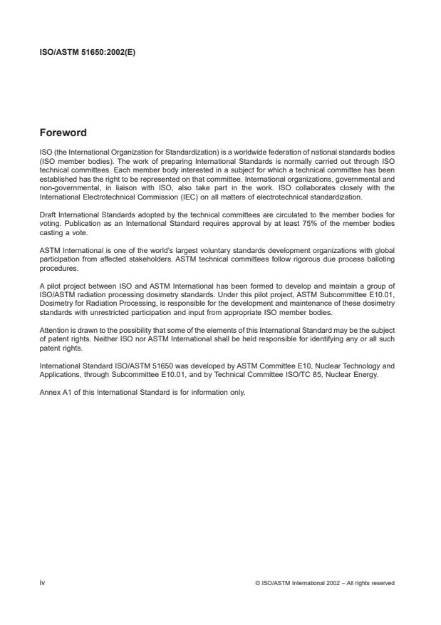 ISO/ASTM 51650:2002 is a standard published by the International Organization for Standardization (ISO). Its full title is "Practice for use of a cellulose triacetate dosimetry system". This standard covers: ISO 51650 covers the preparation, handling, testing and procedures for the use of cellulose acetate dosimetry systems, and the spectrometric, densitometric or photometric read-out equipment for measuring absorbed doses in materials irradiated by photons and electrons in terms of absorbed dose in water. Cellulose acetate dosimeter refers to untinted and tinted cellulose triacetate (CTA) or cellulose diacetate (CDA) film dosimeter. This practice applies to cellulose acetate film dosimeters that can be used within part or all of the specified ranges as follows: the absorbed dose range for untinted CTA is 5 times 103 Gy to 3 times 10 5 Gy for photons and electrons; the absorbed dose range for tinted CDA is 1 times 104 Gy to 1 times 10 6 Gy for photons and electrons; the absorbed dose rate for both CTAand CDA is from 0,03 to 4 times 1010 Gy s -1; the radiation energy range for photons is from 0,1 MeV to 50 MeV; the radiation energy range for electrons is from 0,2 MeV to 50 MeV; the irradiation temperature range is from - 10 °C to 70 °C.