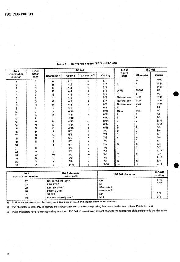 ISO 6936:1983 - Information processing -- Conversion between the two coded character sets of ISO 646 and ISO 6937-2 and the CCITT international telegraph alphabet No. 2 (ITA 2)