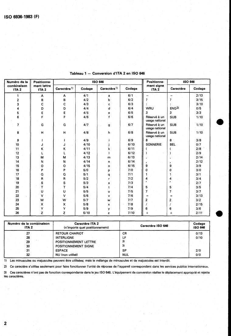 Tableau 1 - Conversion d'ITA 2 en IS0 646