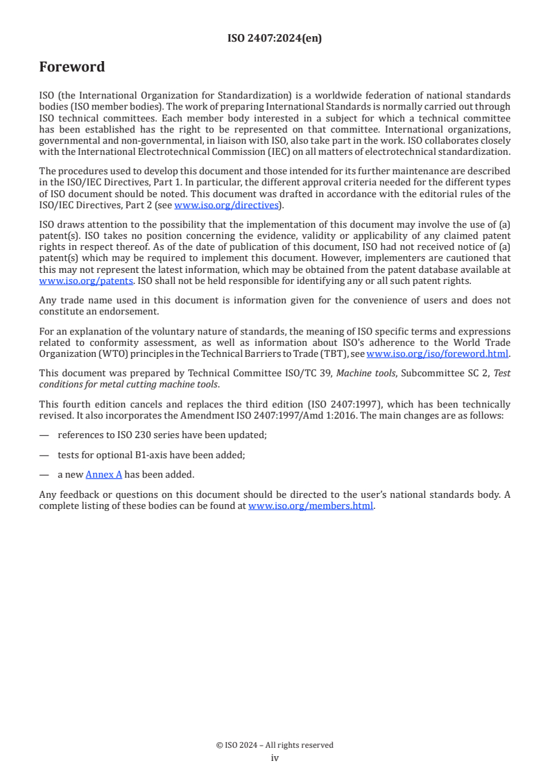ISO 2407:2024 defines standardized test conditions and acceptance criteria for verifying the accuracy of internal cylindrical grinding machines with a horizontal spindle. The fourth edition updates references to the ISO 230 series, adds tests for an optional B1-axis, and introduces a new informative Annex on error motions of axes of rotation. It is focused solely on accuracy verification (geometric, positioning and machining tests) and does not cover dynamic operation checks (vibration, abnormal noise) or routine checks of speeds/feeds.