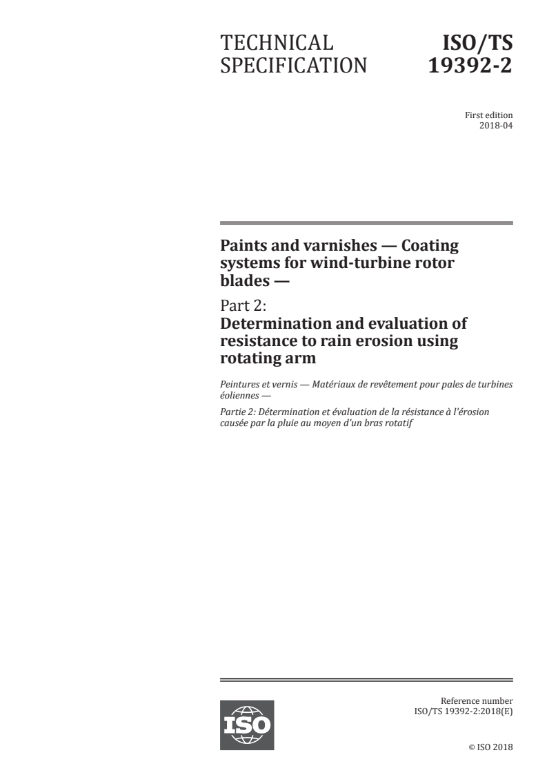 ISO/TS 19392-2:2018 is a technical specification published by the International Organization for Standardization (ISO). Its full title is "Paints and varnishes — Coating systems for wind-turbine rotor blades — Part 2: Determination and evaluation of resistance to rain erosion using rotating arm". This standard covers: This document specifies a test method for the determination of resistance of coating systems or tape for wind-turbine rotor blades to rain erosion by using the rotating arm test.