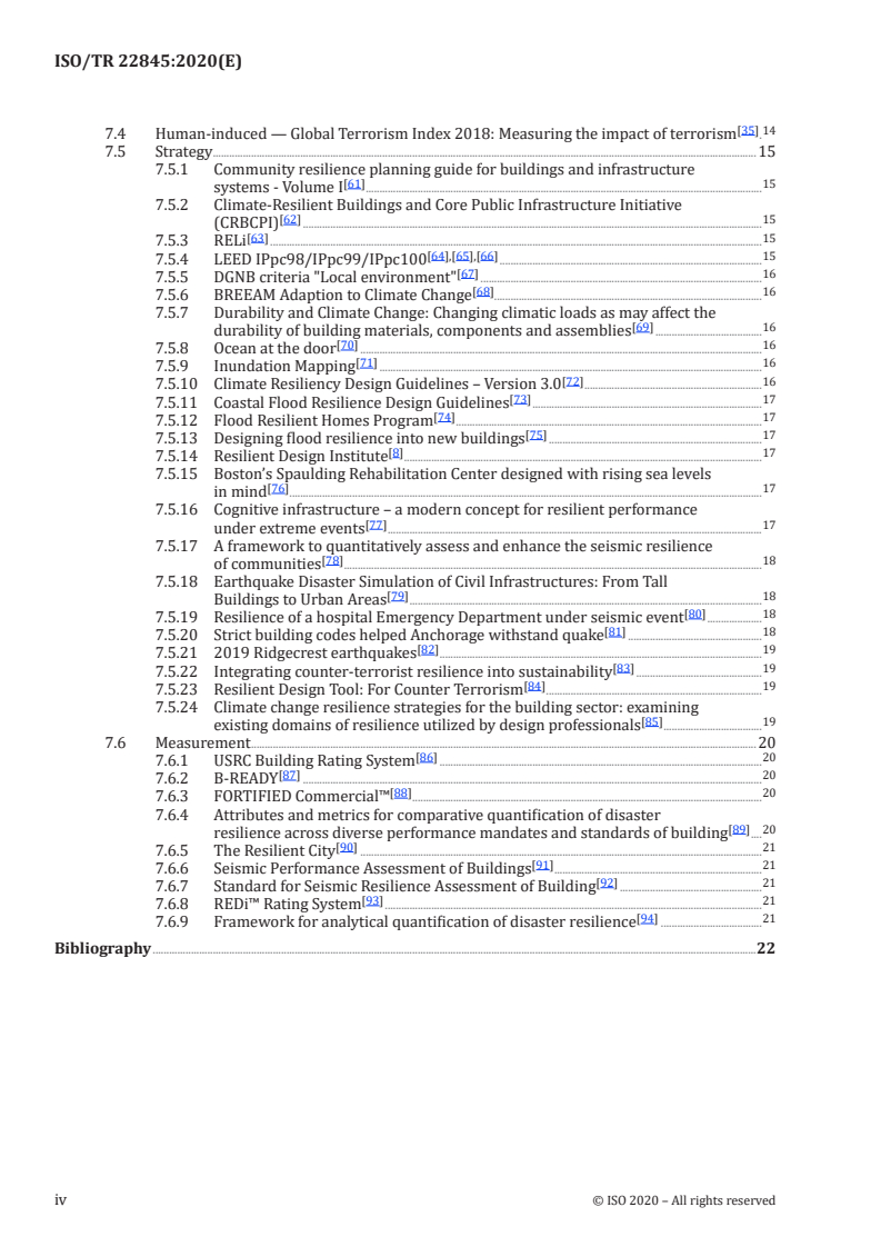 ISO/TR 22845:2020 cross‑references international frameworks and rating tools such as the Sendai Framework for Disaster Risk Reduction, LEED, BREEAM, RELi and multiple resilience rating/measurement systems (USRC, B‑READY, FORTIFIED, REDi). It is best used alongside local building codes and sector‑specific standards for design and compliance.