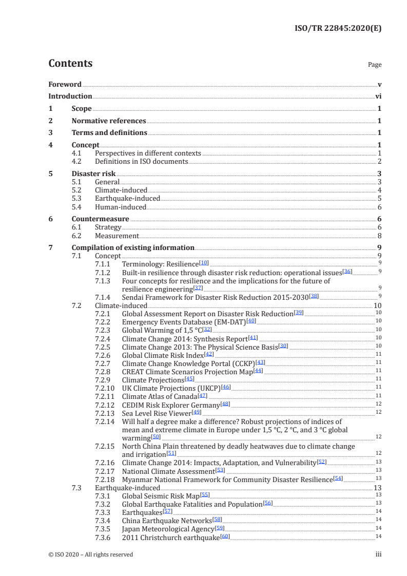 ISO/TR 22845:2020 is a technical report published by the International Organization for Standardization (ISO). Its full title is "Resilience of buildings and civil engineering works". This standard covers: This document provides an index of typical existing information on concept, disaster risk and countermeasure for resilience of buildings and civil engineering works.