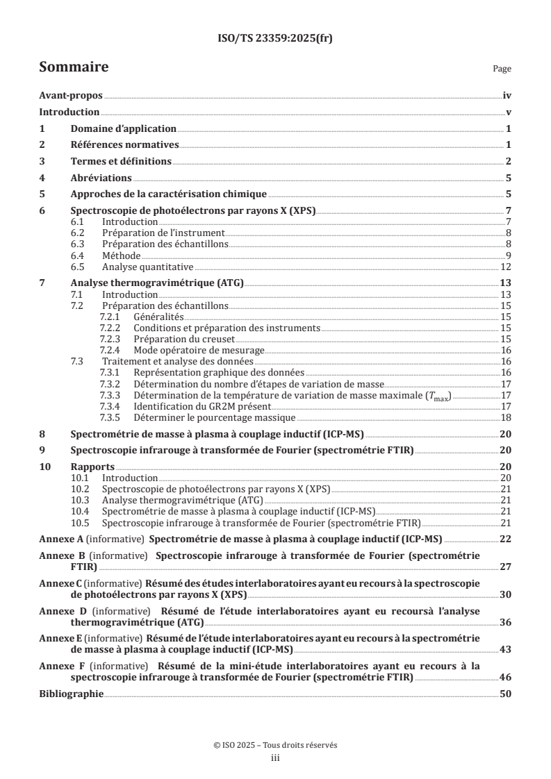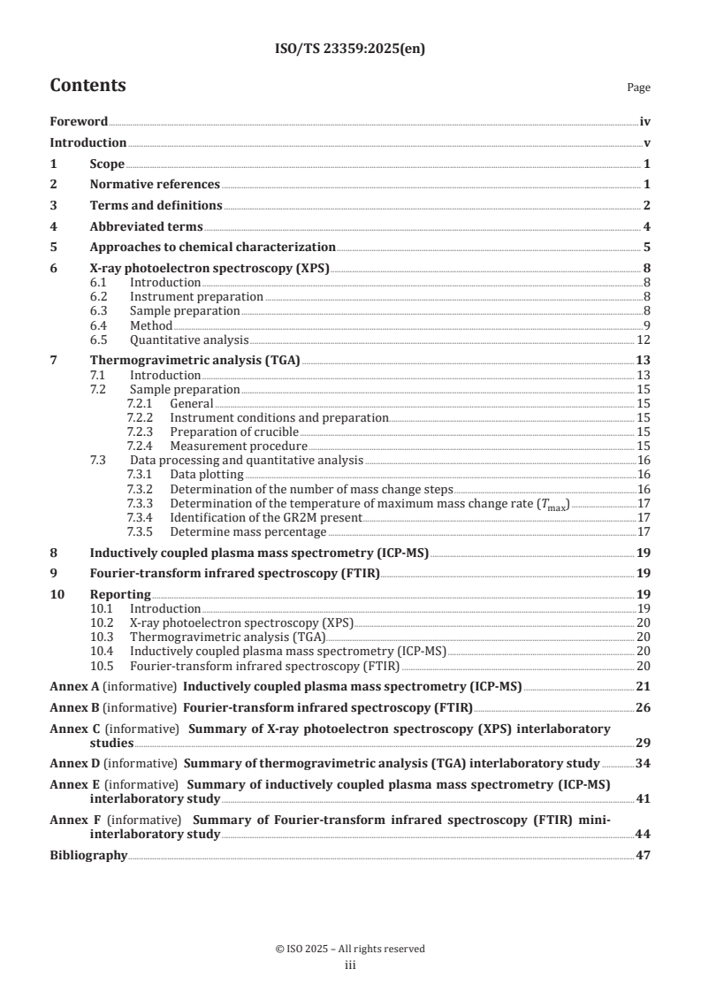 Keywords: ISO/TS 23359:2025, graphene characterization, GR2M, XPS, TGA, ICP‑MS, FTIR, O/C ratio, trace metal impurities, sample preparation, data analysis, nanotechnologies standard.