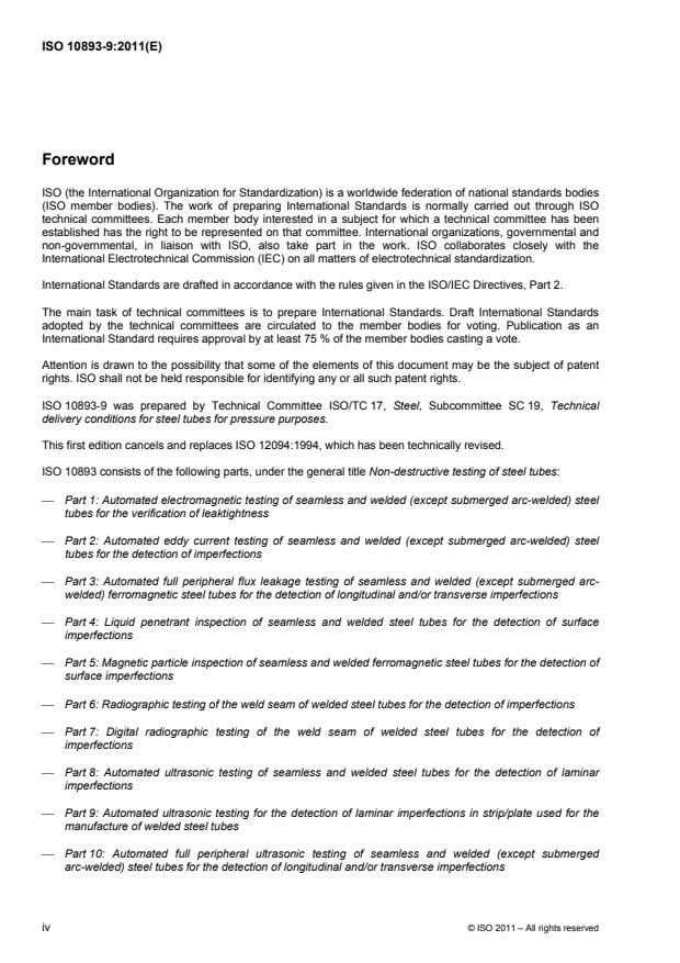 ISO 10893-9:2011 is a standard published by the International Organization for Standardization (ISO). Its full title is "Non-destructive testing of steel tubes - Part 9: Automated ultrasonic testing for the detection of laminar imperfections in strip/plate used for the manufacture of welded steel tubes". This standard covers: ISO 10893-9:2011 specifies requirements for the automated ultrasonic testing of strip/plate used in the manufacture of welded tubes for the detection of laminar imperfections carried out in the pipe mill before or during pipe production. ISO 10893-9:2011 can also be applicable to the testing of strips/plates used in the manufacture of circular hollow sections.