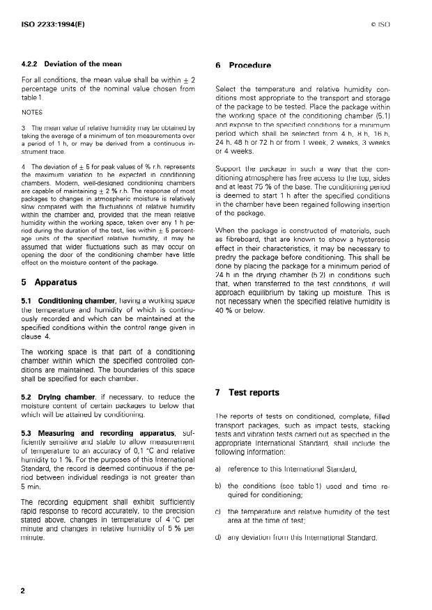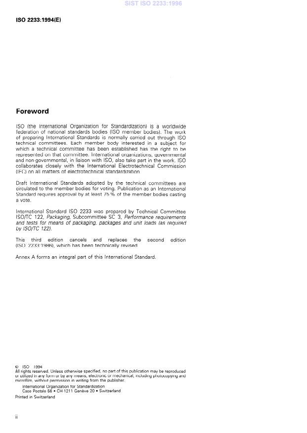 ISO 2233:1994 is a standard published by the International Organization for Standardization (ISO). Its full title is "Packaging — Complete, filled transport packages — Conditioning for testing". This standard covers: Packaging — Complete, filled transport packages — Conditioning for testing