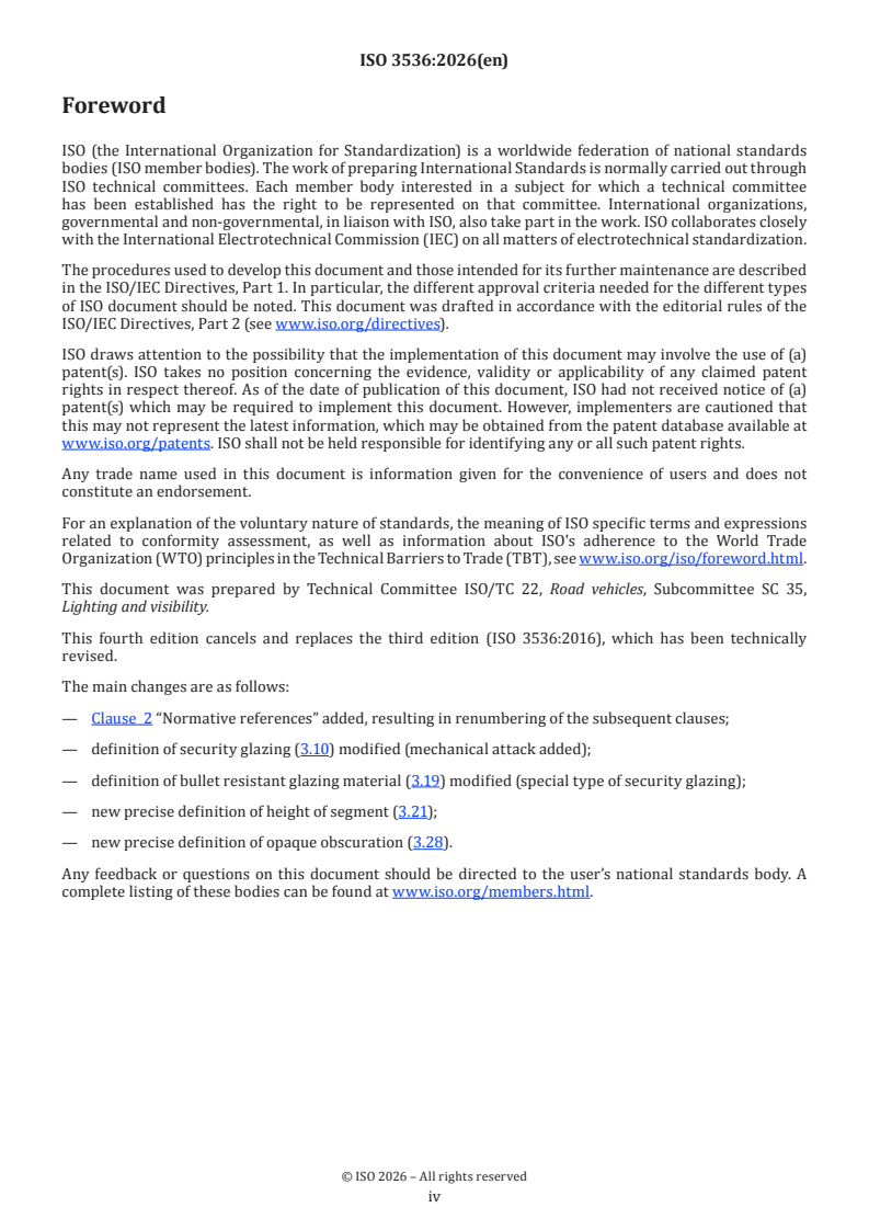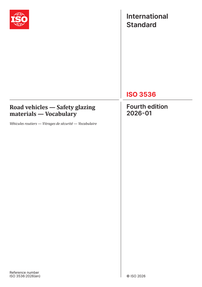 ISO 3536:2026 is a standard published by the International Organization for Standardization (ISO). Its full title is "Road vehicles — Safety glazing materials — Vocabulary". This standard covers: This document defines terms relating to safety glazing materials for road vehicles.