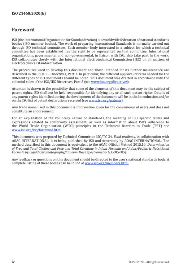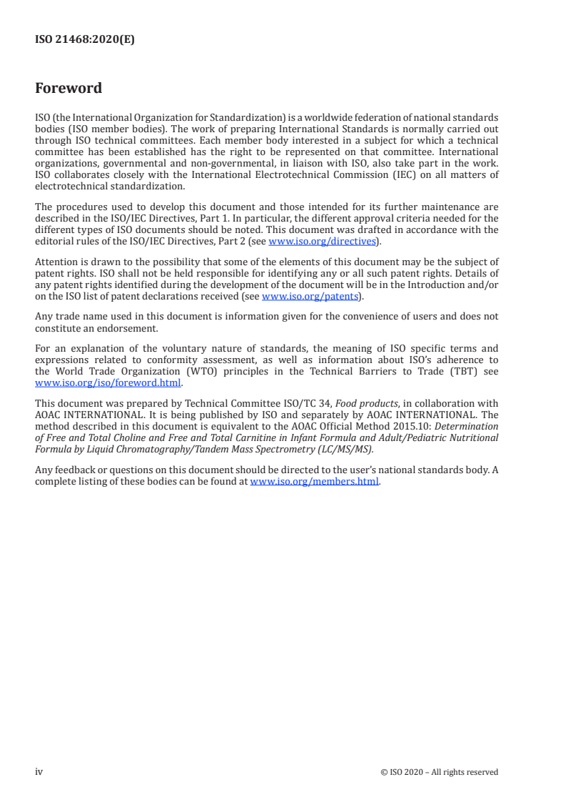 ISO 21468:2020 is a standard published by the International Organization for Standardization (ISO). Its full title is "Infant formula and adult nutritionals — Determination of free and total choline and free and total carnitine — Liquid chromatography tandem mass spectrometry (HPLC-MS/MS)". This standard covers: This document specifies a method for the determination of total or free choline and carnitine in infant formula and adult nutritionals by liquid chromatography and tandem mass spectrometry (HPLC-MS/MS).