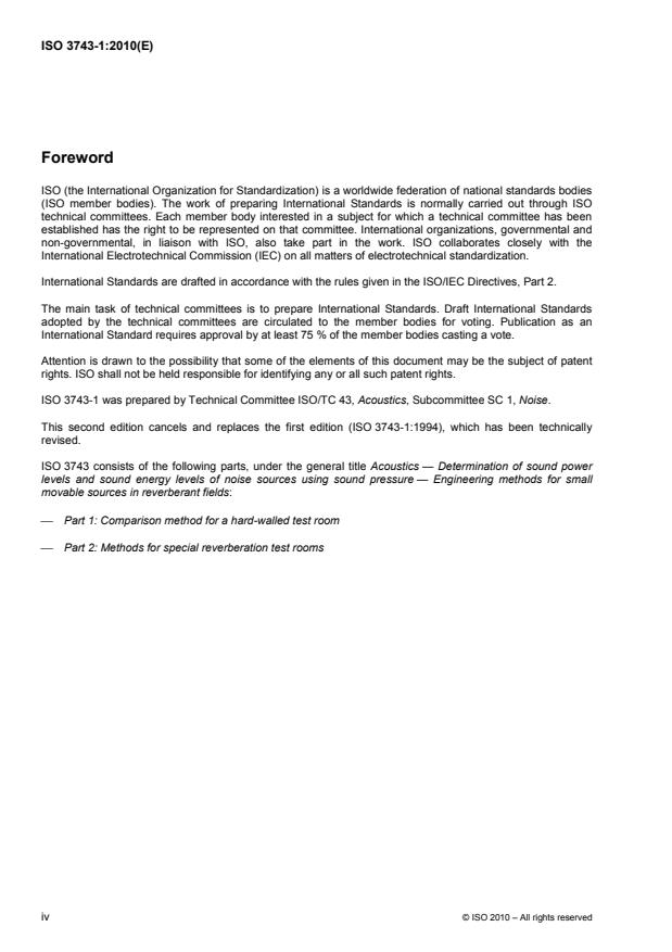ISO 3743-1:2010 is a standard published by the International Organization for Standardization (ISO). Its full title is "Acoustics - Determination of sound power levels and sound energy levels of noise sources using sound pressure - Engineering methods for small movable sources in reverberant fields - Part 1: Comparison method for a hard-walled test room". This standard covers: ISO 3743-1:2010 specifies methods for determining the sound power level or sound energy level of a noise source by comparing measured sound pressure levels emitted by this source (machinery or equipment) mounted in a hard-walled test room, the characteristics of which are specified, with those from a calibrated reference sound source. The sound power level (or, in the case of noise bursts or transient noise emission, the sound energy level) produced by the noise source, in frequency bands of width one octave, is calculated using those measurements. The sound power level or sound energy level with frequency A-weighting applied is calculated using the octave-band levels. The method specified in ISO 3743-1:2010 is suitable for all types of noise (steady, non-steady, fluctuating, isolated bursts of sound energy, etc.) defined in ISO 12001. The noise source under test may be a device, machine, component or sub-assembly. The maximum size of the source depends upon the size of the room used for the acoustical measurements (see 4.2). The test environment that is applicable for measurements made in accordance with ISO 3743-1:2010 is a hard-walled test room with prescribed acoustical characteristics. Information is given on the uncertainty of the sound power levels and sound energy levels determined in accordance with ISO 3743-1:2010, for measurements made in frequency octave bands and for A-weighted frequency calculations performed on them. The uncertainty conforms to ISO 12001:1996, accuracy grade 2 (engineering grade).