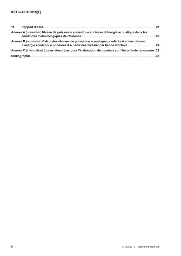- Instrumentation and references: normative references include ISO 6926 (reference sources), IEC 60942 (calibrators), IEC 61672-1 (sound level meters) and IEC 61260 (filters).