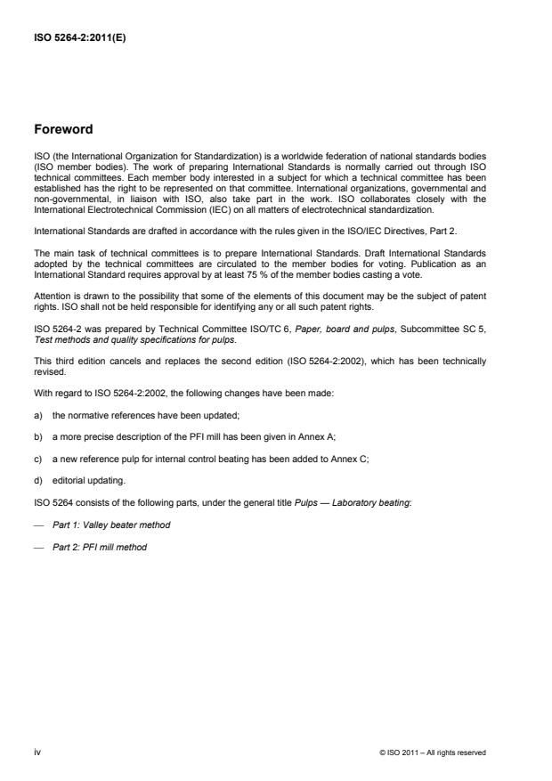 ISO 5264-2:2011 is a standard published by the International Organization for Standardization (ISO). Its full title is "Pulps - Laboratory beating - Part 2: PFI mill method". This standard covers: ISO 5264-2:2011 specifies a method for the laboratory beating of pulp using a PFI mill. The description is limited to the sampling, preparation and beating of the pulp and the beating equipment. In principle, this method is applicable to all kinds of chemical and semi-chemical pulps. In practice, the method might not give satisfactory results with certain pulps having extremely long fibres.