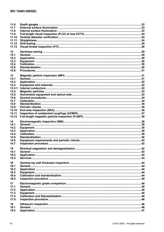ISO 15463:2003 is a standard published by the International Organization for Standardization (ISO). Its full title is "Petroleum and natural gas industries - Field inspection of new casing, tubing and plain-end drill pipe". This standard covers: ISO 15463:2003 specifies requirements and gives recommendations for field inspection and testing of oil country tubular goods (OCTG). ISO 15463:2003 covers the practices and technology commonly used in field inspection; however, certain practices may also be suitable for mill inspections. ISO 15463:2003 covers the qualification of inspection personnel, a description of inspection methods and apparatus calibration and standardization procedures for various inspection methods. The evaluation of imperfections and marking of inspected OCTG are included. ISO 15463:2003 is applicable to field inspection of OCTG and is not applicable for use as a basis for acceptance or rejection (for which the applicable purchasing specification is applicable, see 5.4.2)