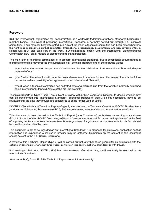 ISO/TR 13739:1998 is a technical report published by the International Organization for Standardization (ISO). Its full title is "Petroleum products — Methods for specifying practical procedures for the transfer of bunker fuels to ships". This standard covers: Petroleum products — Methods for specifying practical procedures for the transfer of bunker fuels to ships