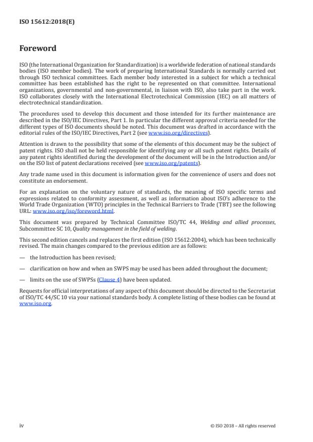 ISO 15612:2018 is a standard published by the International Organization for Standardization (ISO). Its full title is "Specification and qualification of welding procedures for metallic materials - Qualification by adoption of a standard welding procedure specification". This standard covers: This document: - specifies how a user can follow a standard welding procedure specification (SWPS) based on welding procedure qualification tests performed by a different organization; - specifies the range for the use of SWPSs in accordance with ISO 15607; - specifies the requirements for qualification of welding procedures to be issued as SWPSs; and - specifies the requirements for organizations adopting SWPSs. The use of this document can be restricted by an application standard or a specification. This document is applicable to welding of steels and aluminium and its alloys (see 4.1). All new standard welding procedure qualifications are to be carried out in accordance with this document from the date of its issue. However, this document does not invalidate previous standard welding procedure qualifications made to former standards, specifications or previous editions of this document