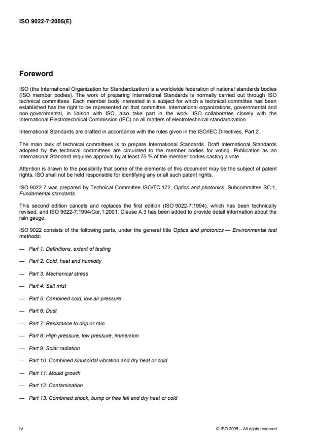 ISO 9022-7:2005 is a standard published by the International Organization for Standardization (ISO). Its full title is "Optics and photonics — Environmental test methods — Part 7: Resistance to drip or rain". This standard covers: ISO 9022-7:2005 specifies methods for the testing of optical instruments and instruments containing optical components under equivalent conditions, for their ability to resist drip or rain. The purpose of testing is to investigate to what extent the optical, thermal, mechanical, chemical and electrical performance characteristics of the specimen are affected by drip or rain. Contamination of drip or rain water due to impurities in the air shall be ignored for the purposes of ISO 9022-7:2005.