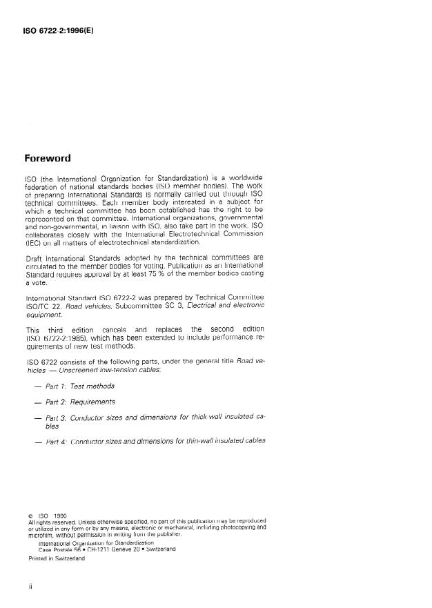 ISO 6722-2:1996 is a standard published by the International Organization for Standardization (ISO). Its full title is "Road vehicles — Unscreened low-tension cables — Part 2: Requirements". This standard covers: Specifies the requirements for unscreened single-core low-tension cables (nominal voltage of 50 V) used in road vehicle applications. It also applies to the individual cores in multi-core cables. Replaces the second edition.