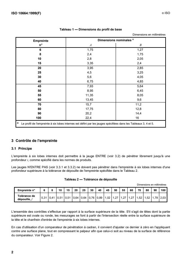 Le profil de l'empreinte à six lobes internes est défini par les contrôles spécifiés dans les Tableaux 3, 4 et 5.