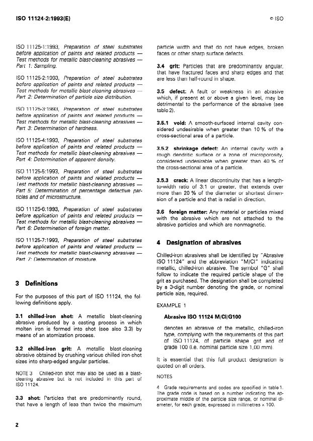ISO 11124-2:1993 is a standard published by the International Organization for Standardization (ISO). Its full title is "Preparation of steel substrates before application of paints and related products — Specifications for metallic blast-cleaning abrasives — Part 2: Chilled-iron grit". This standard covers: Specifies requirements for 12 grades of chilled-iron grit abrasive: designation, sampling, package identification and lot traceability, information to be supplied by the manufacturer or supplier, ranges of particle sizes, hardness, density, defect/structural requirements and chemical composition. The requirements specified apply to abrasives supplied in the "new" condition only.