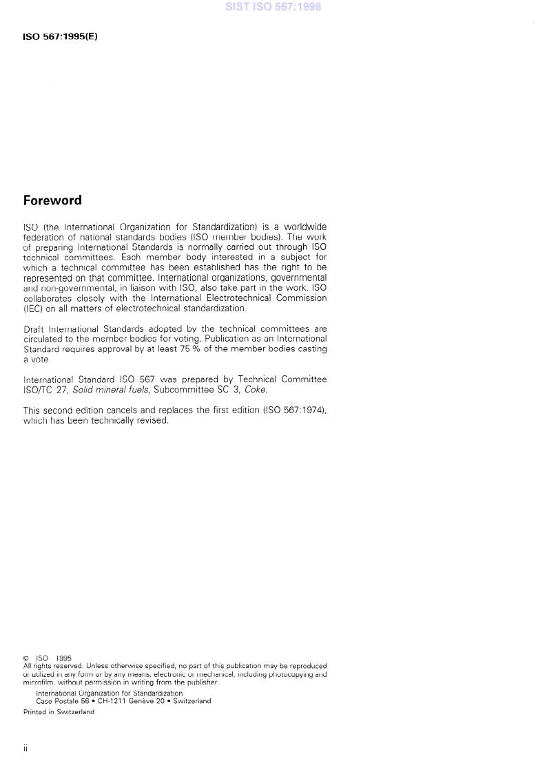0 ISO ISO 567:1995(E) Introduction The bulk density of coke depends upon its physical characteristics, e.g. apparent relative density, shape and size of the coke particles, and upon the dimensions of the Container. The Container specified in this Inter- national Standard has a capacity of 0,2 m3. The determination of bulk density of coke in a large Container is described in ISO 1013. . . . Ill SIST ISO 567:1998