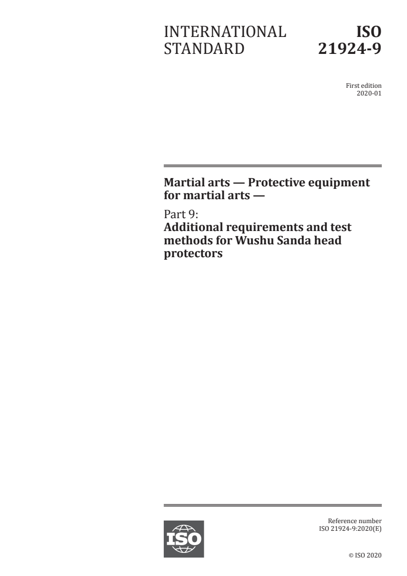 ISO 21924-9:2020 - Martial arts — Protective equipment for martial arts — Part 9: Additional requirements and test methods for Wushu Sanda head protectors Released:1/13/2020
