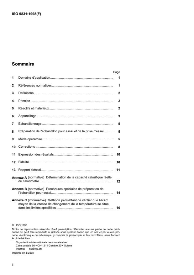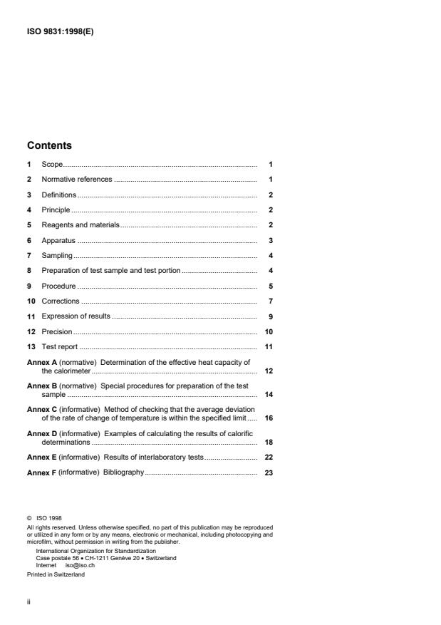 Keywords: ISO 9831:1998, bomb calorimeter, gross calorific value, animal feeding stuffs, calorimetry, effective heat capacity, benzoic acid, adiabatic calorimeter, isothermal calorimeter, sample preparation.