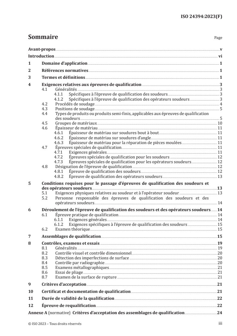 ISO 24394:2023 is a standard published by the International Organization for Standardization (ISO). Its full title is "Welding for aerospace applications — Qualification test for welders and welding operators — Fusion welding of metallic components". This standard covers: This document specifies requirements for the qualification of welders and welding operators for fusion welding of metallic materials for aerospace applications. NOTE Success in the test is an essential precondition for the qualification of welders and welding operators in new production and repair work in aerospace. However, welding equipment operators do not need to be qualified according to this document.