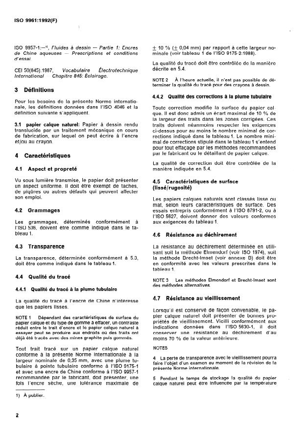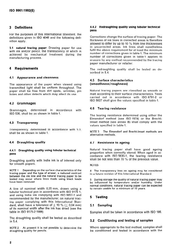 Keywords: ISO 9961:1992, natural tracing paper, draughting media, technical drawings, transparency, tear resistance, grammage, draughting quality, reflectance method.