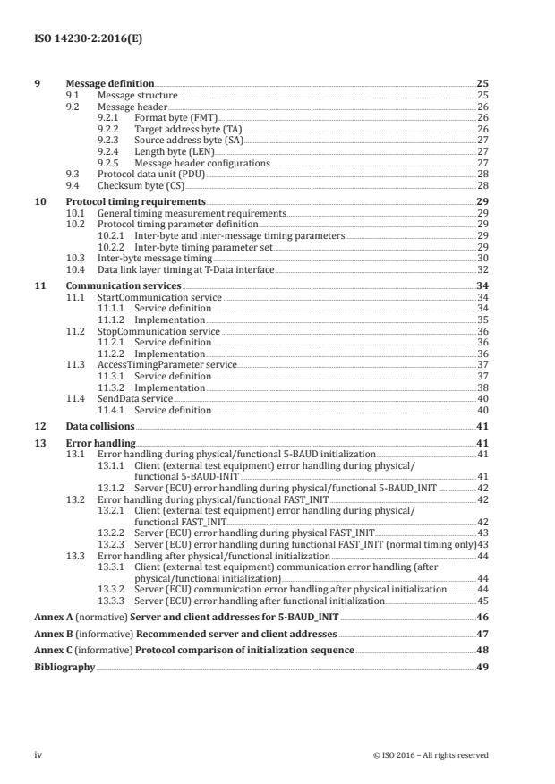 ISO 14230-2:2016 specifies data link layer services tailored to meet the requirements of UART-based vehicle communication systems on K-Line as specified in ISO 14230‑1. It has been defined in accordance with the diagnostic services established in ISO 14229‑1 and ISO 15031‑5, but is not limited to use with them and is also compatible with most other communication needs for in-vehicle networks. The protocol specifies an unconfirmed communication. The diagnostic communication over K-Line (DoK-Line) protocol supports the standardized service primitive interface as specified in ISO 14229‑2. ISO 14230-2:2016 provides the data link layer services to support different application layer implementations like the following: - enhanced vehicle diagnostics (emissions-related system diagnostics beyond legislated functionality, non-emissions-related system diagnostics); - emissions-related OBD as specified in ISO 15031, SAE J1979-DA and SAE J2012-DA; - in addition, ISO 14230-2:2016 clarifies the differences in initialization for K-line protocols defined in ISO 9141 and ISO 14230. This is important since a server supports only one of the protocols mentioned above and the client has to handle the coexistence of all protocols during the protocol determination procedure.