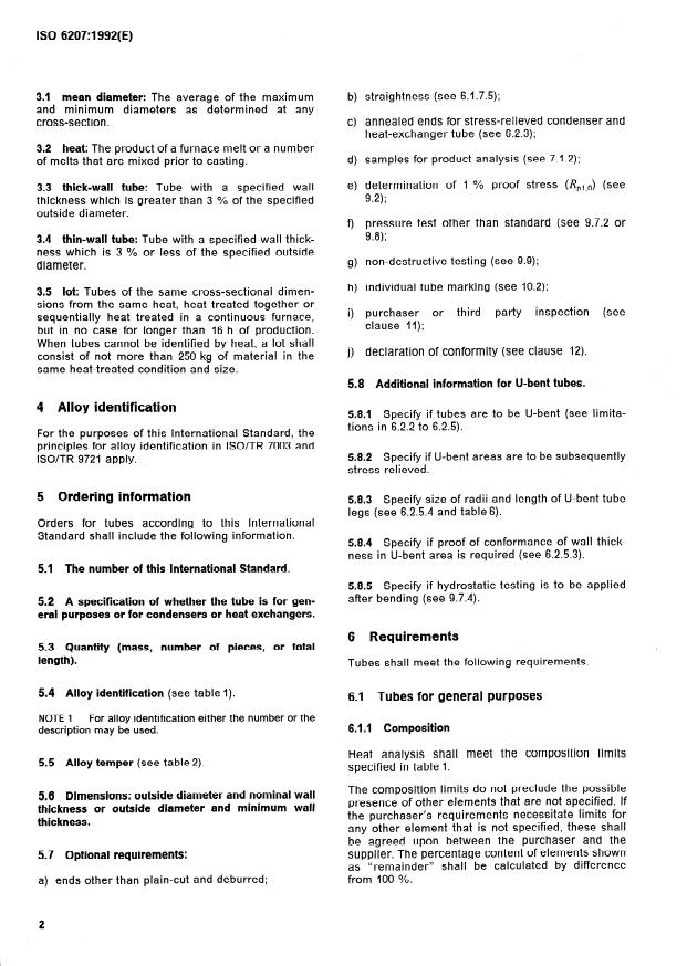 Specifies requirements (composition, mechanical properties, dimensional tolerances, limiting bend radii) and test procedures for the following materials in the following size ranges: tube for general purpose: cold worked - outside diameter 4 mm to 240 mm, hot worked - outside diameter 38 mm to 240 mm; tube for condenser and heat-exchanger applications: cold worked - maximum outside diameter 80 mm with wall thickness up to and including 5 mm. Annex A lists ISO methods of analysis.