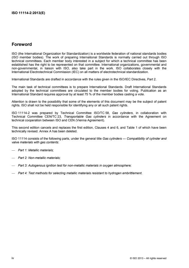 ISO 11114-2:2013 is a standard published by the International Organization for Standardization (ISO). Its full title is "Gas cylinders — Compatibility of cylinder and valve materials with gas contents — Part 2: Non-metallic materials". This standard covers: ISO 11114-2:2013 gives guidance in the selection and evaluation of compatibility between non-metallic materials for gas cylinders and valves and the gas contents. It also covers bundles, tubes and pressure drums. ISO 11114-2:2013 can be helpful for composite and laminated materials used for gas cylinders. It does not cover the subject completely and is intended to give guidance only in evaluating the compatibility of gas/material combinations. Only the influence of the gas in changing the material and mechanical properties is considered (for example chemical reaction or change in physical state). The basic properties of the materials, such as mechanical properties, required for design purposes are normally available from the materials' supplier and are not considered. The compatibility data given are related to single component gases but can be used to some extent for gas mixtures. Ceramics, glasses, and adhesives are not covered. Other aspects such as quality of delivered gas are not considered. ISO 11114-2:2013 is not intended to be used for cryogenic fluids (see ISO 21010).