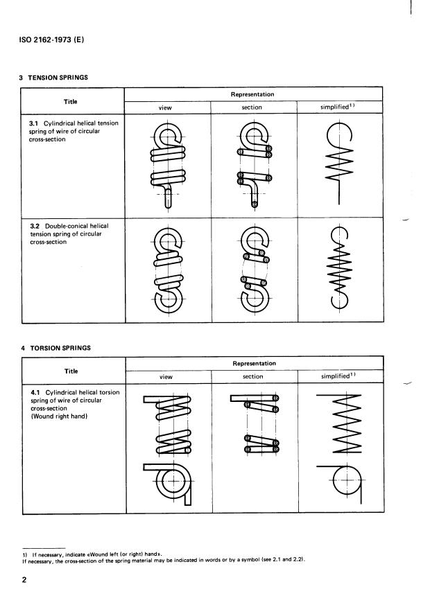 ISO 2162:1973 is a standard published by the International Organization for Standardization (ISO). Its full title is "Technical drawings — Representation of springs". This standard covers: Technical drawings — Representation of springs