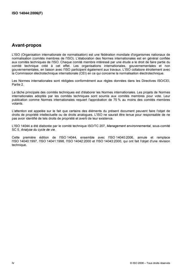 L'ISO 14044:2006 spécifie les exigences et fournit les lignes directrices pour la réalisation d'analyses du cycle de vie (ACV) comprenant: la définition des objectifs et du champ de l'étude, la phase d' inventaire du cycle de vie, la phase d'évaluation de l'impact du cycle de vie, la phase d'interprétation du cycle de vie, la communication et la revue critique de l'analyse du cycle de vie, les limitations de l'analyse du cycle de vie, la relation entre les phases de l'analyse du cycle de vie et les conditions d'utilisation des choix de valeur et des éléments facultatifs. L'ISO 14044:2006 traite des études d'analyse du cycle de vie et des études d'inventaire du cycle de vie.