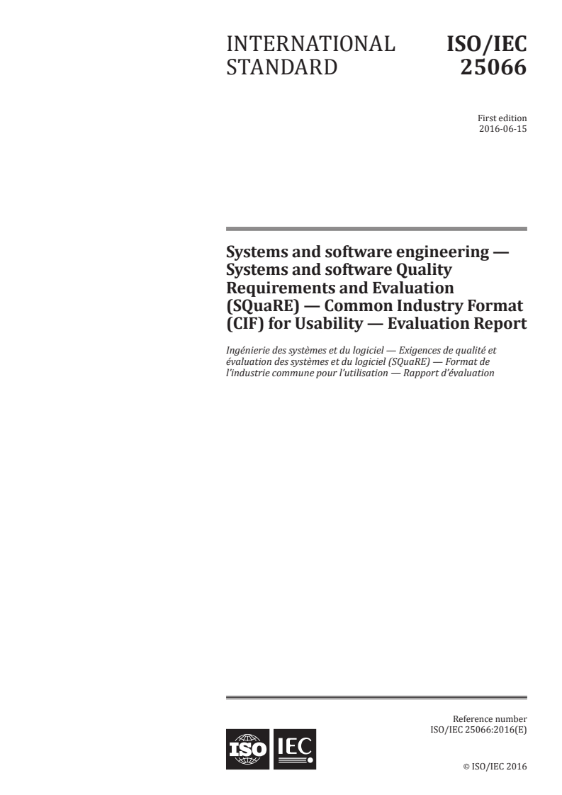 ISO/IEC 25066:2016 - Systems and software engineering — Systems and software Quality Requirements and Evaluation (SQuaRE) — Common Industry Format (CIF) for Usability — Evaluation Report/13/2016