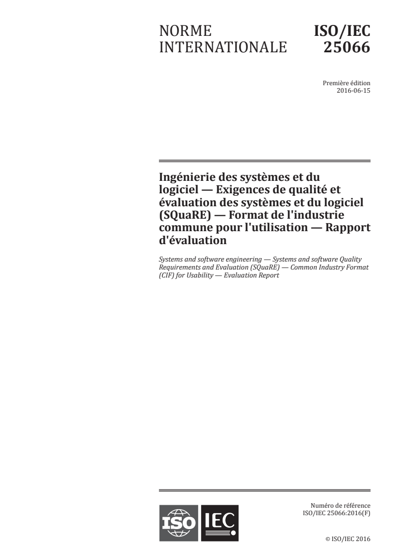 ISO/IEC 25066:2016 - Ingénierie des systemes et du logiciel -- Exigences de qualité et évaluation des systemes et du logiciel (SQuaRE) -- Format de l'industrie commune pour l'utilisation -- Rapport d'évaluation