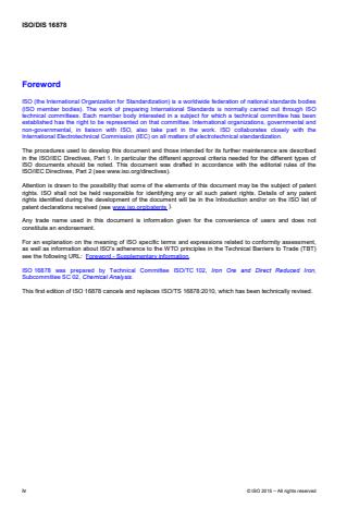 ISO 16878:2016 is a standard published by the International Organization for Standardization (ISO). Its full title is "Iron ores - Determination of metallic iron content - Iron(III) chloride titrimetric method". This standard covers: ISO 16878:2016 specifies a titrimetric method for the determination of the metallic iron content of reduced iron ores. This method is applicable to a concentration range of 57,5 % mass fraction to 90,5 % mass fraction of the metallic iron. NOTE The term "metallic iron" means those forms of iron not bonded to oxygen or not present as pyrite.