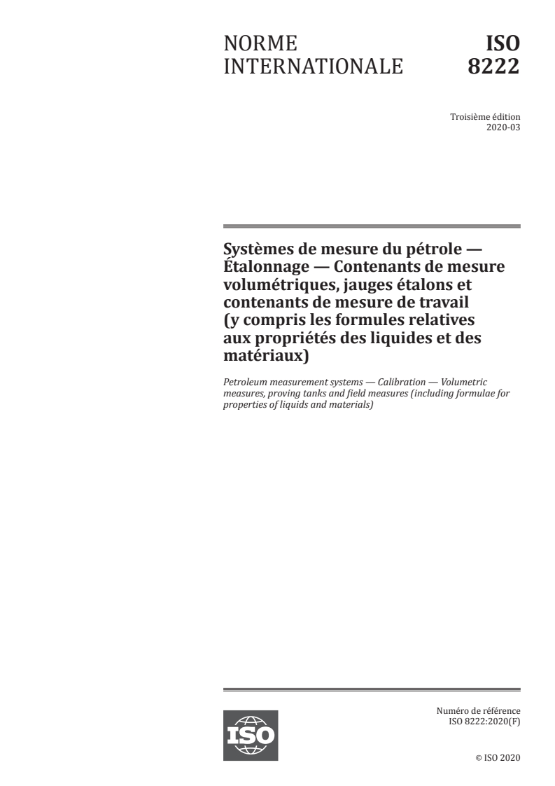 ISO 8222:2020 - Systèmes de mesure du pétrole — Étalonnage — Contenants de mesure volumétriques, jauges étalons et contenants de mesure de travail (y compris les formules relatives aux propriétés des liquides et des matériaux) Released:5/26/2020