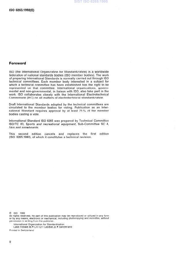 ISO 6265:1992 is a standard published by the International Organization for Standardization (ISO). Its full title is "Alpine skis — Determination of deformation load and breaking load". This standard covers: Specifies a method for determining the resistance of alpine skis to permanent deformation and breaking. Applies to all sizes of alpine skis for adults, juveniles and children.