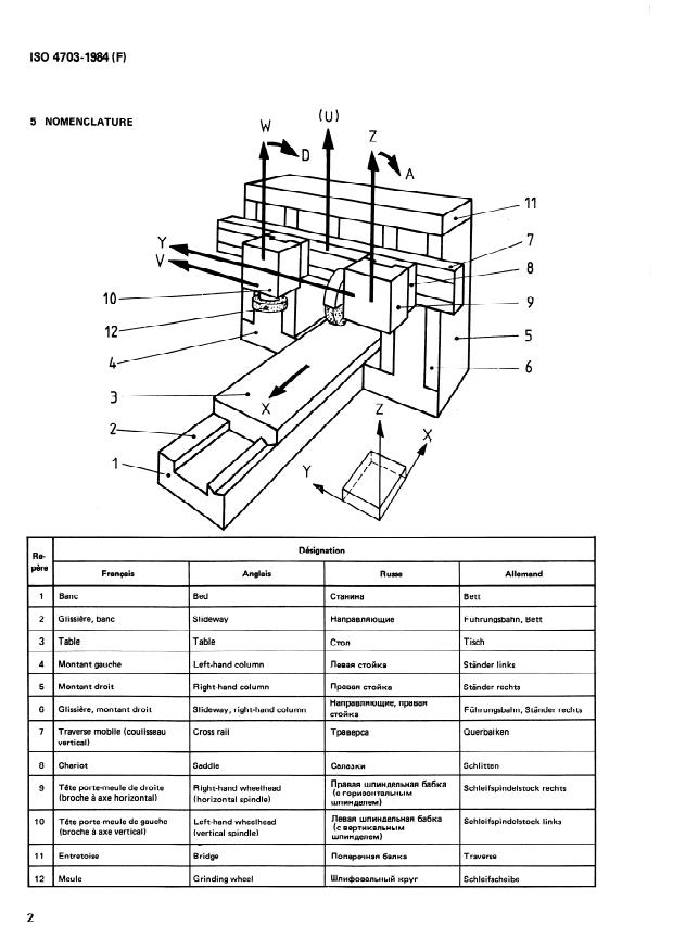 ISO 4703:1984 is a standard published by the International Organization for Standardization (ISO). Its full title is "Acceptance conditions for surface grinding machines with two columns — Machines for grinding slideways — Testing of accuracy". This standard covers: Specifies both geometrical and practical tests on these general purpose and normal accuracy grinding machines, and gives the corresponding permissible deviations which apply. The machines covered here are machines with rectilinear grinding movements and with a movable table. ISO 4703 deals only with the verification of the accuracy of the machine. It does not apply to the testing of the running of the machine or to characteristics, which shall generally be checked before the acuracy is tested.