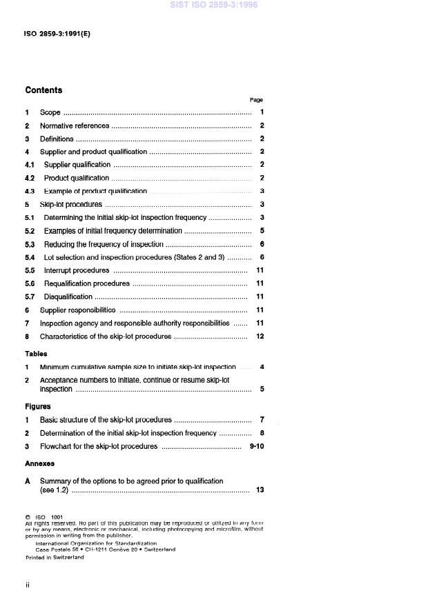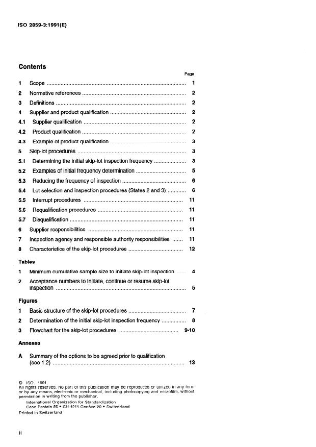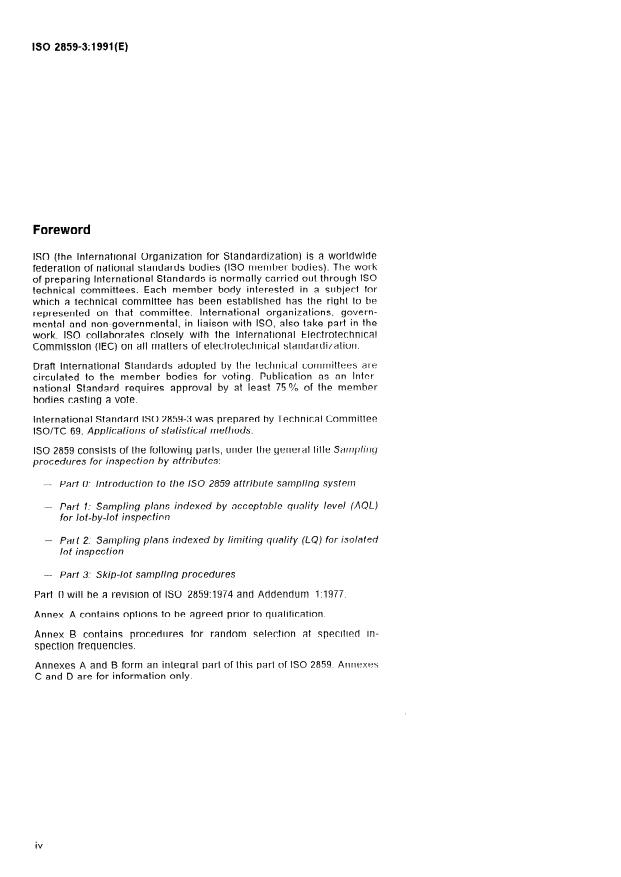 ISO 2859-3:1991 is a standard published by the International Organization for Standardization (ISO). Its full title is "Sampling procedures for inspection by attributes — Part 3: Skip-lot sampling procedures". This standard covers: The procedures specified are applicable to the inspection of: end items, components and raw materials, services, materials in process, supplies in storage, data or records, administrative procedures. Annexes A and B form an integral part of this standard. Annexes C and D are for information only.