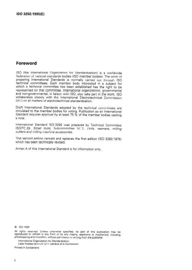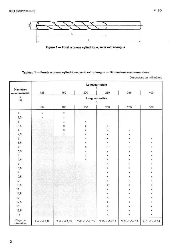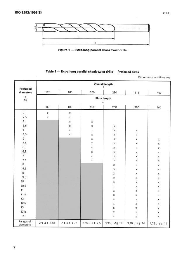 ISO 3292:1995 is a standard published by the International Organization for Standardization (ISO). Its full title is "Extra-long parallel shank twist drills". This standard covers: Gives the dimensions and a list of the preferred diameters of extra-long parallel shank twist drills in the range 2 mm to 14 mm with an overall length range of 125 mm to 400 mm.
