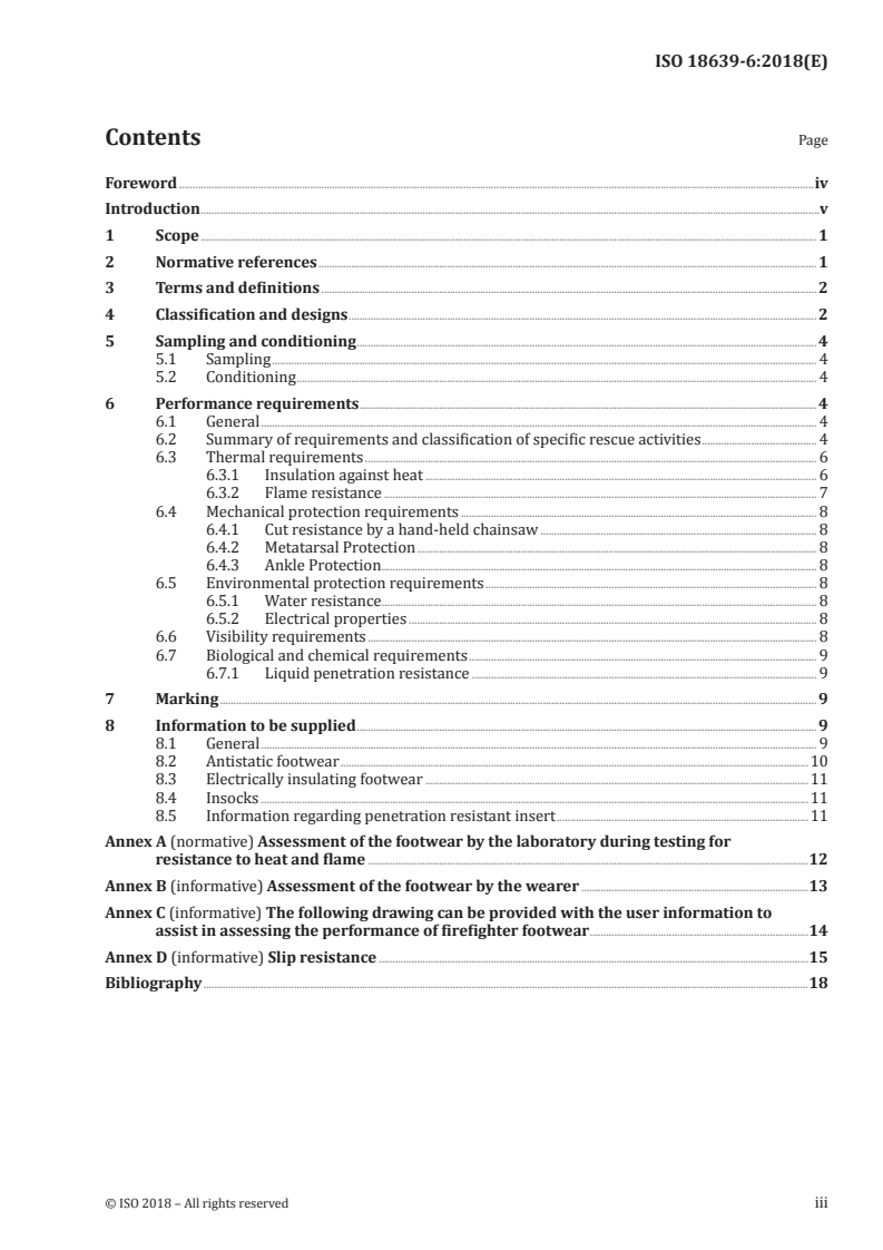 ISO 18639-6:2018 provides the principles that govern the development of incident type and/or hazard specific test methods and minimum performance requirements for safety footwear for firefighters while engaged in specific rescue activities. Footwear related to specific rescue activities, e.g. Road Traffic Crash, (RTC) and Urban Search and Rescue, (USAR) is documented in individual subclauses of this document. NOTE For further guidance refer ISO 18639‑1. The purpose of ISO 18639-6:2018 is to ensure minimum performance requirements for incident type and/or hazard specific safety footwear are designated. ISO 18639-6:2018 covers general footwear design, the minimum performance level of the materials used and the methods of test for determining this performance level. ISO 18639-6:2018 does not cover special footwear for use in other high risk situations such as structural firefighting. ISO 18639-6:2018 does not cover protection for the head, torso, arms, hands and legs or protection of the feet against other hazards, e.g. chemical, biological, radiation and electrical hazards, except for limited, accidental exposure to fire ground chemicals and contaminated blood or body fluids. Selection of the appropriate system of Personal Protective Equipment, (PPE), including footwear, is dependent on carrying out an effective risk assessment which identifies the hazard to be faced, evaluates the likelihood of those hazards and provides the means of reducing or eliminating these hazards.