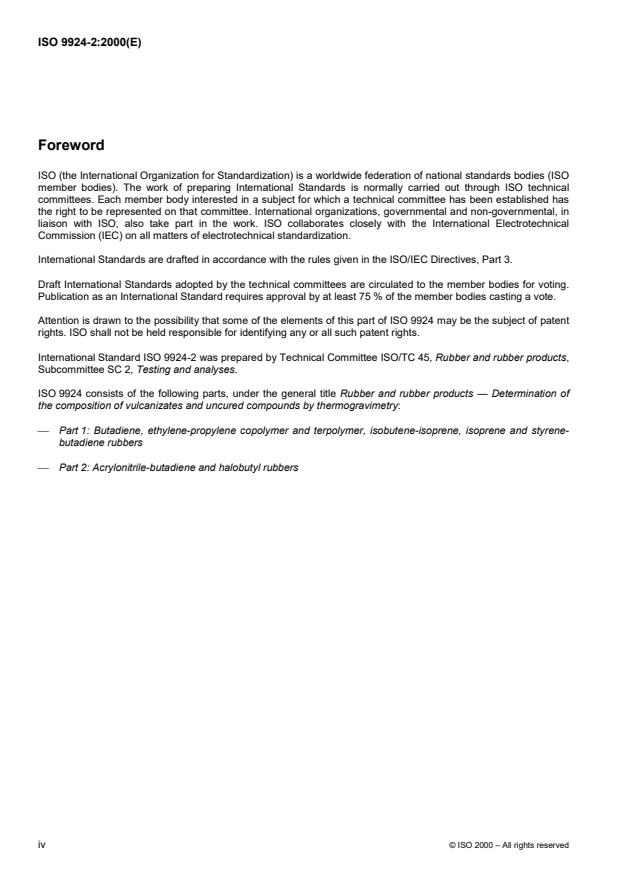 ISO 9924-2:2000 is a standard published by the International Organization for Standardization (ISO). Its full title is "Rubber and rubber products — Determination of the composition of vulcanizates and uncured compounds by thermogravimetry — Part 2: Acrylonitrile-butadiene and halobutyl rubbers". This standard covers: Rubber and rubber products — Determination of the composition of vulcanizates and uncured compounds by thermogravimetry — Part 2: Acrylonitrile-butadiene and halobutyl rubbers