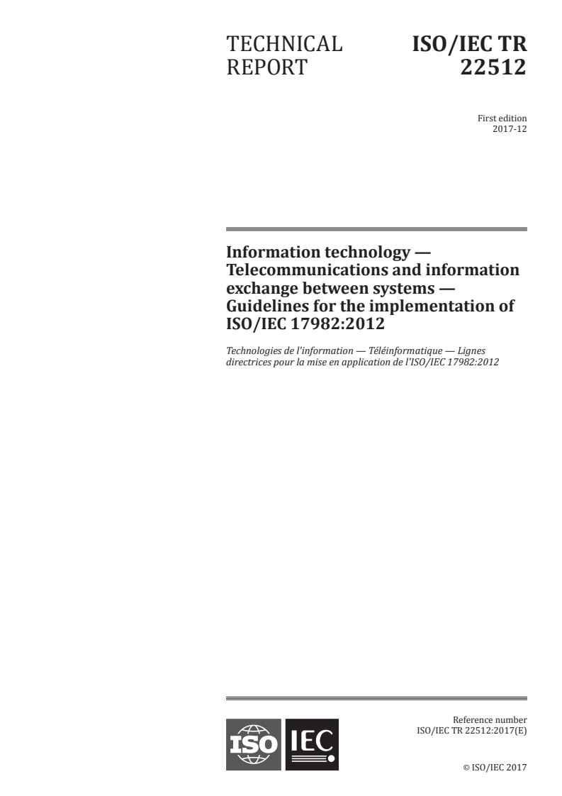 ISO/IEC TR 22512:2017 is a technical report published by the International Organization for Standardization (ISO). Its full title is "Information technology — Telecommunications and information exchange between systems — Guidelines for the implementation of ISO/IEC 17982:2012". This standard covers: ISO/IEC TR 22512:2017 provides guidance for the implementation of ISO/IEC 17982.