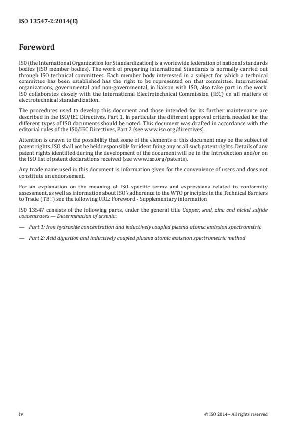 ISO 13547-2:2014 is a standard published by the International Organization for Standardization (ISO). Its full title is "Copper, lead, zinc and nickel sulfide concentrates - Determination of arsenic - Part 2: Acid digestion and inductively coupled plasma atomic emission spectrometric method". This standard covers: ISO 13547-2:2014 specifies an acid digestion and inductively coupled plasma atomic emission spectrometric (ICP-AES) method for the determination of the mass fraction of arsenic in copper, lead, zinc, and nickel sulfide concentrates as follows: for copper sulfide concentrates, the method is applicable to the determination of mass fractions of arsenic from 0,05 % to 2,0 %; for lead sulfide concentrates, the method is applicable to the determination of mass fractions of arsenic from 0,05 % to 1,0 %; for zinc sulfide concentrates, the method is applicable to the determination of mass fractions of arsenic from 0,05 % to 0,6 %; for nickel sulfide concentrates, the method is applicable to the determination of mass fraction of arsenic from 0,05 % to 1,0 %.